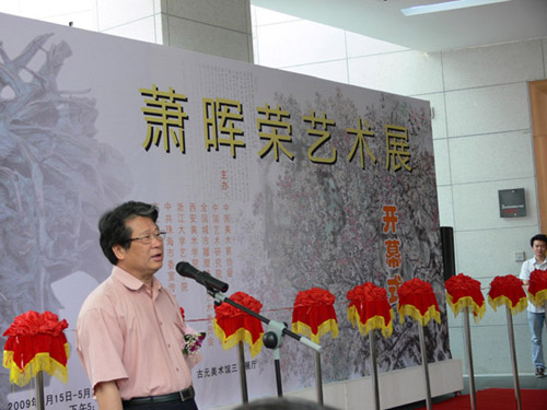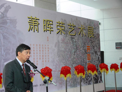 由中国美术家协会、中国艺术研究院、中国雕塑院、全国城市雕塑建设艺术委员会、西安美术学院、浙江大学艺术学院、珠海市委宣传部、古元美术馆联合主办《萧晖荣艺术展─中国画.雕塑》目前假「古元美术馆」隆重开幕,中国人民政治协商会议全国委员会常委、中国致公党中央委员会副主席李卓彬、中央人民政府驻香港特别行政区联络办公室秘书长赵广庭、中国美术家协会常务副主席、党组书记吴长江、中国国家博物馆副馆长、常务副书记姜丰义、中国美术家协会副主席、广东画院院长、广东省美术家协会主席许钦松、中国美术家协会雕塑艺术委员会主任、著名雕塑家盛扬伉俪、全国城市雕塑艺术委员会主任 著名雕塑家曹春生、中国美术家协会副秘书长陶勤、珠海市委常委、宣传部长黄晓东、珠海市政协副主席刘青华、珠海市美术家协会主席古锦其在艺术家萧晖荣教授陪同下剪彩揭幕,来自海内外艺术界及各界知名人士近300人出席,场面十分热闹,好评如潮。本次展出萧教授由上世纪七十年代至今的中国画作品65件和雕塑作品各83件,展期至本月29日。 萧晖荣教授作画能工能写,能大能小,能放能收,表现出全面的艺术素养。他擅长绘制花卉、山水,亦作人物,尤喜画梅花,是位极具大家风范之当代艺术家,从二十世纪八十年代开始,凭着锲而不舍的毅力,从探索绘画的技法,到探寻中国绘画史上梅花的历程,以至历代梅花诗词的研究,全方位地丰富其梅花作品的艺术和文学内涵。是次展出有多件梅花作品,如《万玉迎瑞图》、《万玉争辉图》、《松梅颂》、《梅友兴会图》等,为画坛赞为前无古人之作。