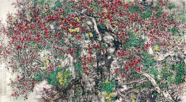 此幅和谐图色彩明艳,画面欢快饱满,整体“密不透风”,但紧致的空间布局又没有压抑之感,流通的水增加了画面的灵动,产生动静结合的美妙感。涌动秀水,葱郁竹林,繁盛梅花,雄浑古石……相映成趣,让人感觉到空灵、灵动,很好地把丰富和意境的简约结合在一起。