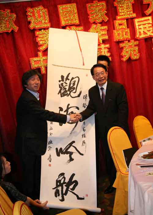 中国美术馆馆长范迪安向萧晖荣赠送自己书法作品