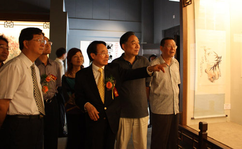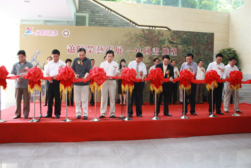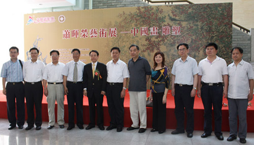 由中国美术家协会、中国艺术研究院?中国雕塑院、浙江大学艺术学院、西安美术学院、浙江大学艺术学院、《人民日报》神州画院、江苏省海外联谊会、江苏省政协港澳台侨委员会、江苏省文学艺术界联合会、江苏省美术馆、江苏省美术家协会、江苏省中国画院联合主办,镇江博物馆承办的“萧晖荣艺术展——中国画?雕塑”六月十日上午10时在镇江博物馆隆重开幕。江苏省政协常委、江苏省委统战部副部长、江苏省政协港澳台侨委员会主任、江苏省海外联谊会副会长李熙诚;江苏省政协常委、江苏省文化厅副厅长、江苏省美术馆馆长高云;全国人大代表、江苏省文联副主席、江苏省国画院院长、江苏省美术家协会主席宋玉麟;全国政协委员、中国书法家协会副主席、江苏省文联副主席言恭达;原江苏省政府副秘书长、江苏省华夏文化经济促进会副会长周光明;中国将军书画院副院长、原江苏省军区副司令员吕振林将军;中山陵园管理局党委书记单捍政;中共镇江市委常委、宣传部长张洪水;镇江市政协副主席许能斌;镇江市政协副主席、统战部长宦祥宝;镇江市名城左究会会长钱永波;江苏省政协港澳台侨委员会办公室主任赵剑;江苏省委统战部联络处副处长、江苏省海外联谊会副秘书长赵锡南;江苏省政协港澳台侨委员会办公室调研员侯福同;镇江市委宣传部副部长宋成玺;镇江市文联党组书记蒋宁参加了开幕式并剪彩。来自省市有关部门的领导、社会各界的书画美术爱好者二百多人参加了开幕式。