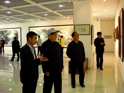 汕头艺苑文化广场副总经理萧培创陪同杨光喜先生参观书画展览