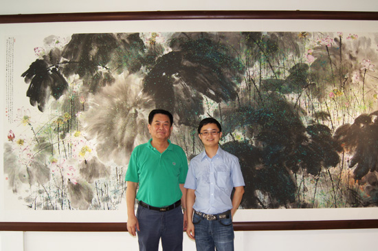 沈冰虹主任与萧培扬副总经理在萧晖荣教授绘画作品前合影
