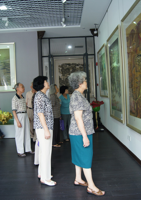 来访嘉宾认真欣赏书画作品